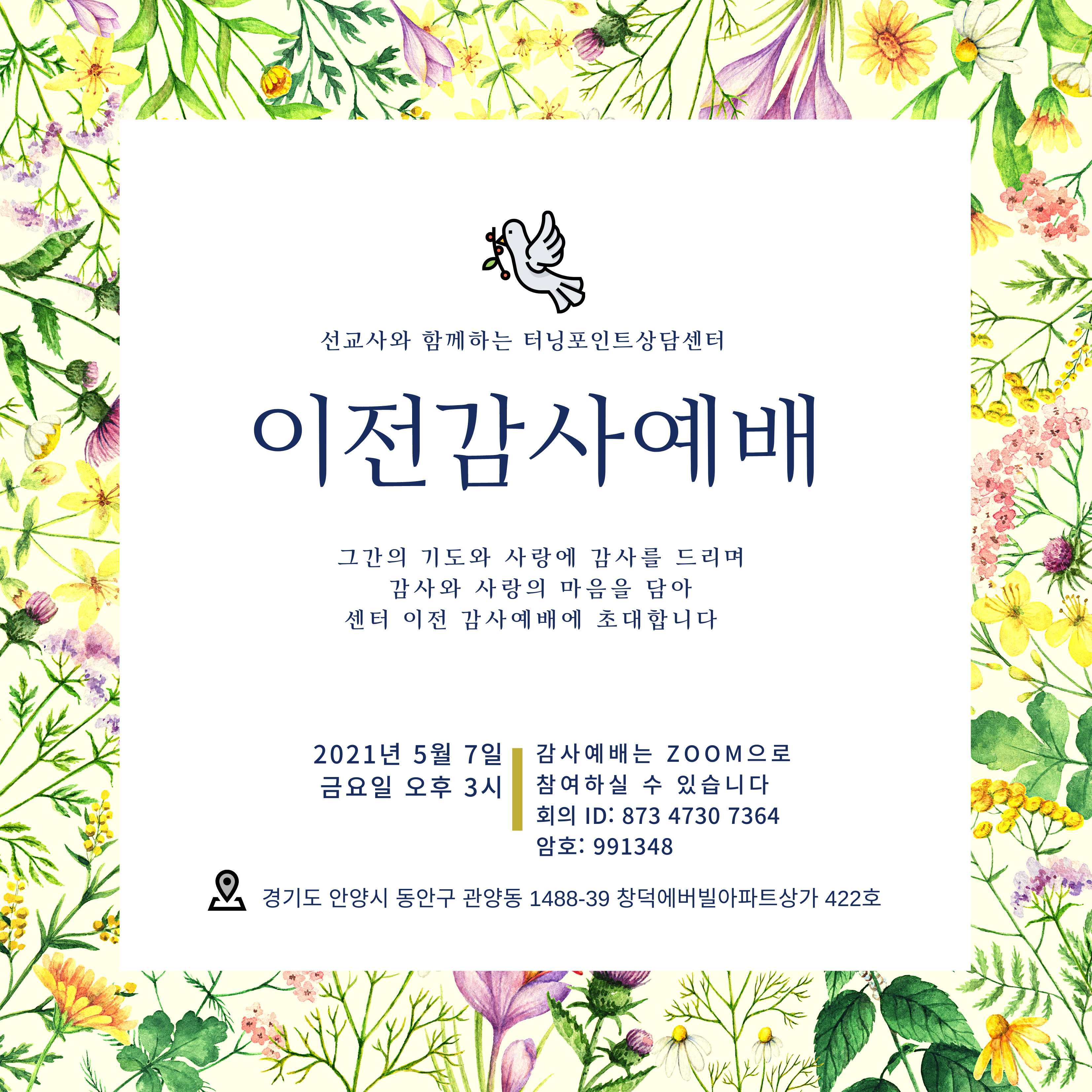 소식 터닝포인트 이전 감사 GMF 선교회 선교사들에게 상담을 제공하는 터닝포인트 사역이 상담센터를 이전하였습니다. 축하와 격려를 해 주시고 이전 예배에 함께 하실 분들은 아래 포스터의 줌 안내를 통해 함께 할 수 있습니다. 공유하기 게시글 관리 (사)한국해외선교회 저작자표시 (새창열림) '소식' Related Articles FMnC 대표 이취임 예배 도서 '하나님의 경제 정의' 출간 신입생 환영회 한국 선교운동과 선교사 (도서)