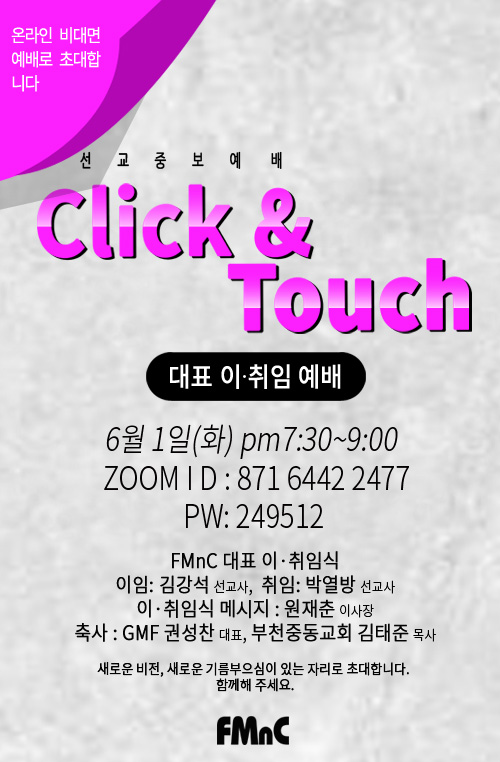 소식 FMnC 대표 이취임 예배 GMF 선교회 GMF에 속한 파송기관 중에 기술과학전문인 선교회인 FMnC가 있습니다. 6월 1일에 그 동안 대표로 섬겨 온 김강석 선교사님이 이임하고 새롭게 박열방 선교사님이 대표로 취임합니다. 성실한 마음으로 단체를 섬기고 이임하는 김강석 선교사님의 앞으로의 사역과 새롭게 이 사역을 감당할 박열방 선교사님의 사역을 위해 기도를 부탁 드립니다. 줌으로 함께 하실 분들은 아래 포스터의 정보를 확인해 주세요. 줌으로 함께 해 주세요. 공유하기 게시글 관리 (사)한국해외선교회 저작자표시 (새창열림) '소식' Related Articles GMF 감사 (2002-2019)로 섬기신 최윤호 장로님 (회계사) 소천 GMTC 62기 선교사 훈련 졸업 도서 '하나님의 경제 정의' 출간 터닝포인트 이전 감사