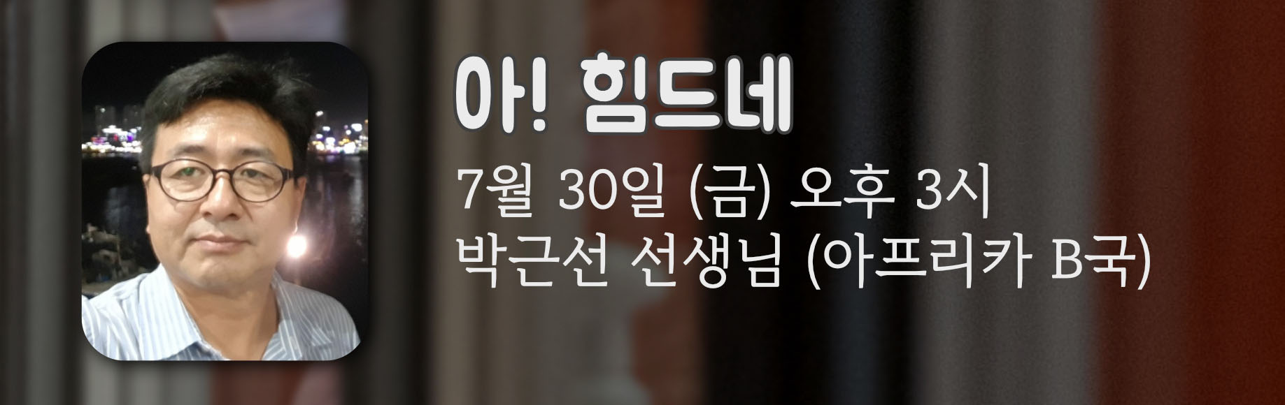 이방인의 뜰 여름특집 "코로나가 내게로 왔다"를 진행하고 있습니다. 이번 금요일에는 아프리카 B국에서 사역하시는 박근선 선생님을 초대하여 이야기를 들었습니다. 동영상과 유튜브 링크를 올립니다. 못 보신 분들 시청해 주세요^^