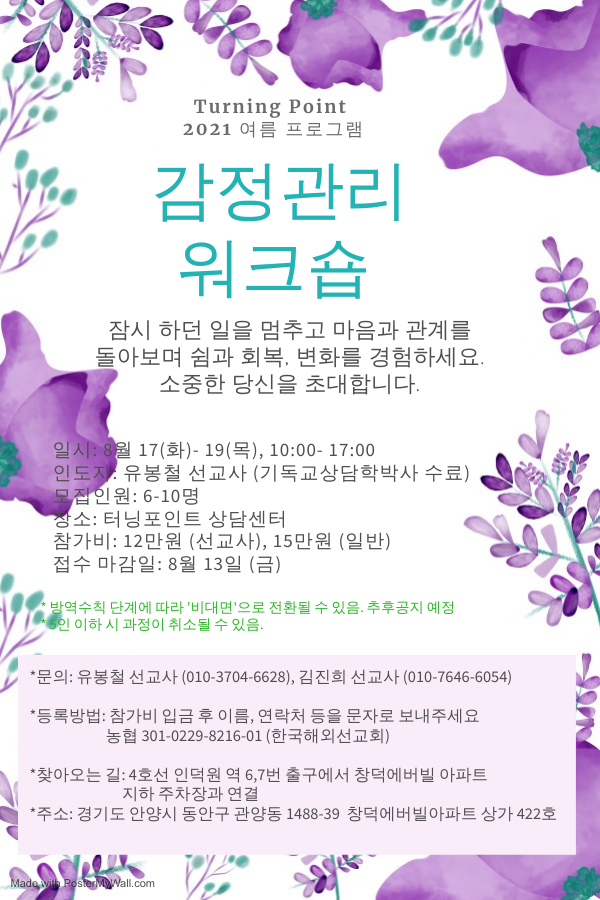 소식 터인포인트 감정관리 워크숍 GMF 선교회 터닝 포닝트에서 여름 프로그램의 하나로 감정관리 워크숍을 진행합니다. 공유하기 게시글 관리 (사)한국해외선교회 저작자표시 (새창열림) '소식' Related Articles 체리와 만나 보세요. 책 소개: 자신학화 HOPE 총회와 GPTI 훈련 수료 GMF를 소개합니다.