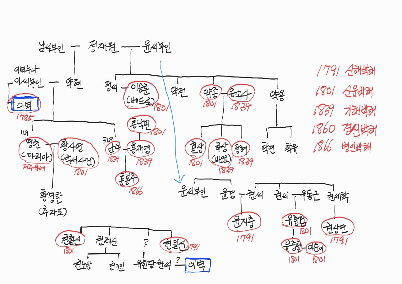 이벽의 누나인 이씨부인(여성 이름을 추적하기 쉽지 않네요)이 정약현과 혼인합니다. 그 사이에서 난 첫 딸이 명현, 셋째 딸이 난수입니다. 이벽의 조카들입니다. 명련은 황사영과 혼인하는데 1801년 백서 사건으로 능지처참 당한 인물입니다. 그 일로 명현은 제주 대정의 관노로 유배갑니다. 가면서 어린 아들 황경한을 추자도에 남겼습니다. 난수는 홍재영과 혼인했는데 홍재영의 부친인 홍낙민은 1801년, 난수와 홍재영은 1839년 기해박해 때 그리고 그들의 아들인 홍봉주는 1866년 병인박해 때 순교합니다. 이벽의 매형인 정약현의 이복 동생들을 봅니다. 그들은 얼마전 자산어보라는 영화로 조명된 약전과 약용 그리고 둘 사이에 있는 약종입니다. 약종은 1801년에 장남 철상과 함께 순교하고 약종의 아내 유소사와 둘째 아들 하상 그리고 딸 정혜는 1839년에 순교합니다. 이들 형제의 누나가 정씨부인이고 최초의 세례자 이승훈과 혼인했습니다. 이승훈에게 복음을 전하고 중국 방문시 세례를 받고 오도록 요청한 사람이 이벽입니다. 이승훈은 1801년에 순교합니다. 이들 정씨 형제의 외삼촌이 윤경인데 전라도 진산 쪽에서 일어난 일은 윤경의 아들 윤지충, 윤지충의 외사촌인 권상연과 유항검과 관련됩니다. 1791년 소위 진산사건이라고 제사를 거부하고 부모의 신주를 불태운 일로 윤지충과 권상연이 순교하고, 1801년에 유항검이 순교합니다.
