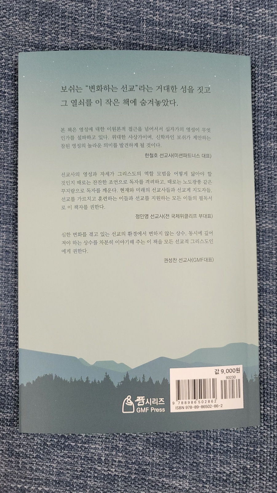 뒷 면에 이런 카피 글이 눈에 들어 옵니다. '보쉬는 "변화하는 선교"라는 거대한 성을 짓고 그 열쇠를 이 작은 책에 숨겨 놓았다'. 선교적 영성을 추구하는 모든 그리스도인들에게 이 책을 권합니다. 이미 여러 교회에서 구역과 목장 리더들을 위한 교재 및 필독서로 삼을 것을 의논해 주셨습니다. 감사 드립니다. 책값은 아주 착하게 9000원입니다. 이 봄에 선교적 영성을 회복하는 계기가 되기를 소망합니다. 샬롬.