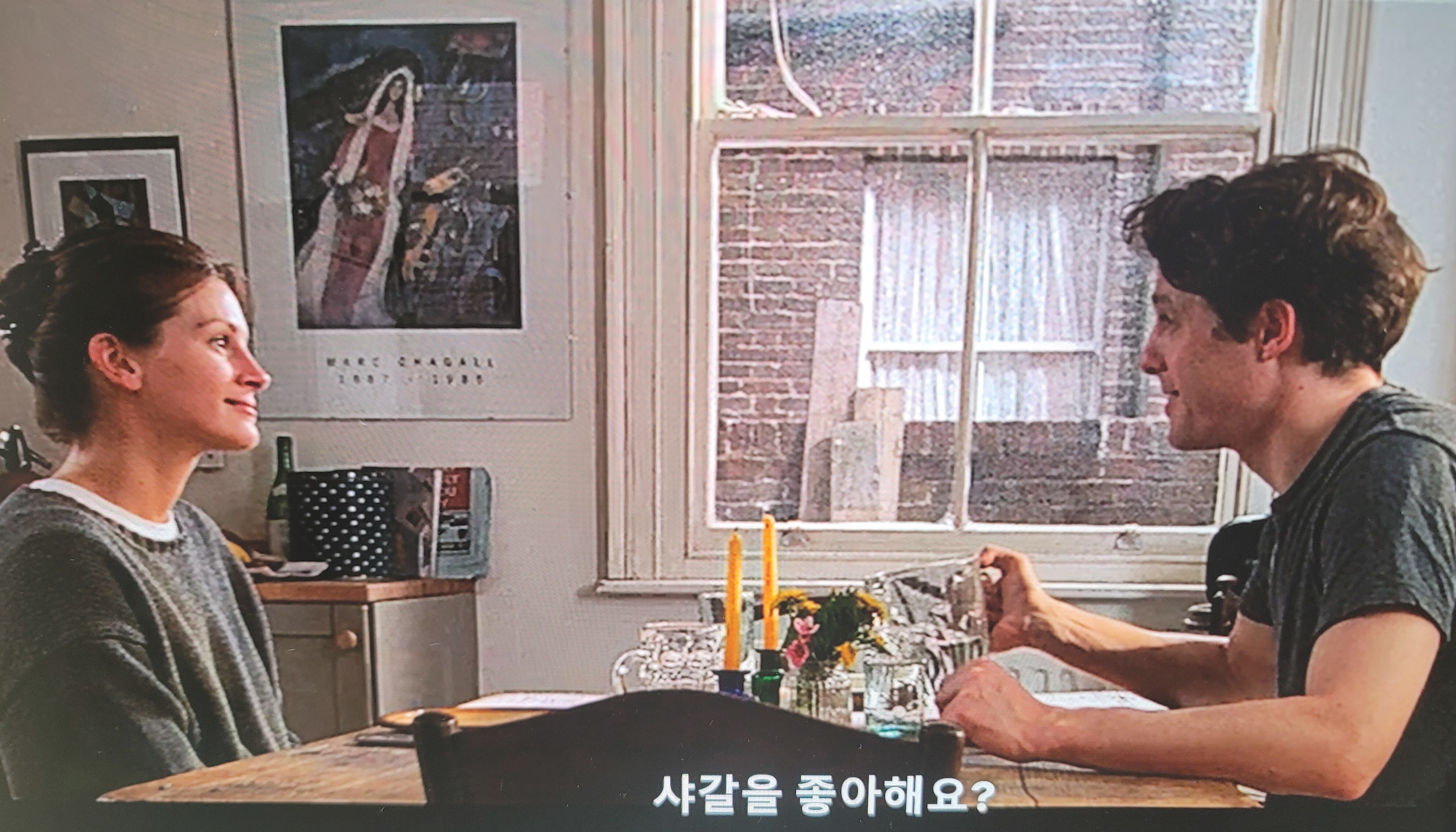 마침 휴일이라 넷플릭스로 들어가 '노팅힐'을 처음부터 자세히 보기 시작했습니다. 그랬더니 이미 윌리엄 집에 그 샤갈의 그림 포스터가 있었고 심지어 '샤갈을 좋아하냐'는 대화도 있었고 나중에 사과할 일이 있던 대스타 안나가 자기 집에 걸려 있던 같은 그림 원본을 영국 재방문 때 가지고 와서 윌리엄에게 준다는 설정이었습니다. 그런데 그 중요한 설정이 이전에 영화를 볼 때는 하나도 안 보였던 것입니다. 그리고 샤갈의 그림을 알게 된 후에야 그것이 너무나 분명히 보인 것이죠.
