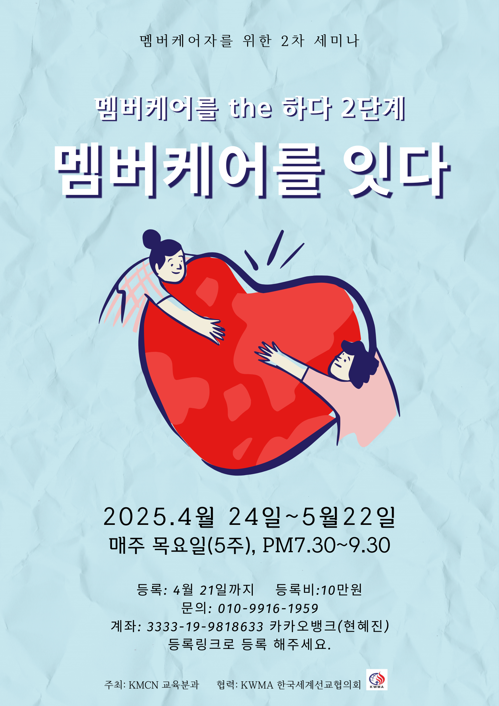 KMCN교육분과에서 멤버케어자를 위한 교육 시즌2 "멤버케어 the하다"의 2단계를 시작합니다. 선교사 멤버케어의 다양한 영역을 조금 더 깊이 이해하는데 도움이 되기를 바랍니다. 2단계: 멤버케어