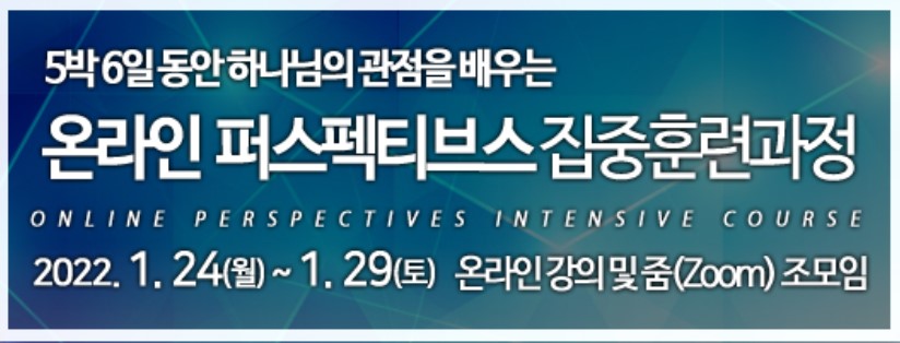 미션파트너스에서 퍼스펙티브스 집중과정을 1월24-29일까지 온라인으로 하는데, 주로 선교사와 목회자를 대상으로 한다고 알려 왔습니다. 반추의 시대에 좋은 기회가 될 것으로 보입니다.
